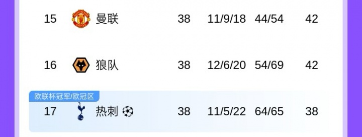 上赛季英超,曼联与热刺堪称“难兄难弟”,曼联42分排名第15,热刺38分排名第17。