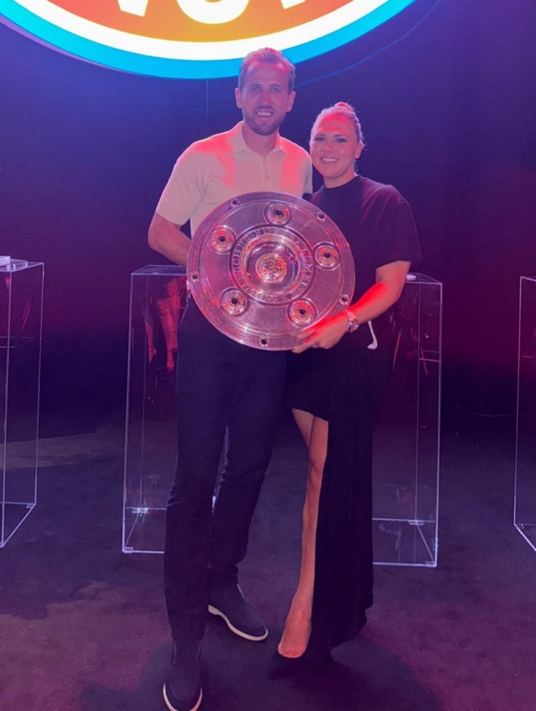 凯蒂社媒晒出手捧德甲冠军奖盘与凯恩的合照,配文:“德甲冠军。”