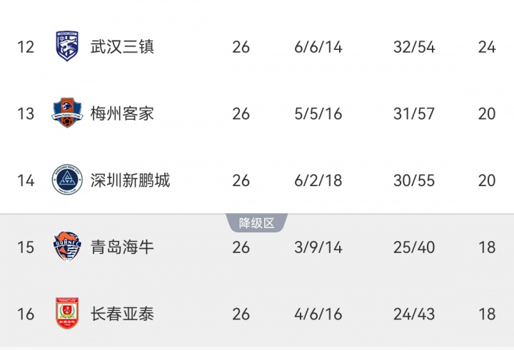 在联赛仅剩4轮的情况下,亚泰与海牛同积18分,而梅州和深圳同积20分。按照规则,赛季结束后中超联赛排名最后两位的球队降入中甲。
